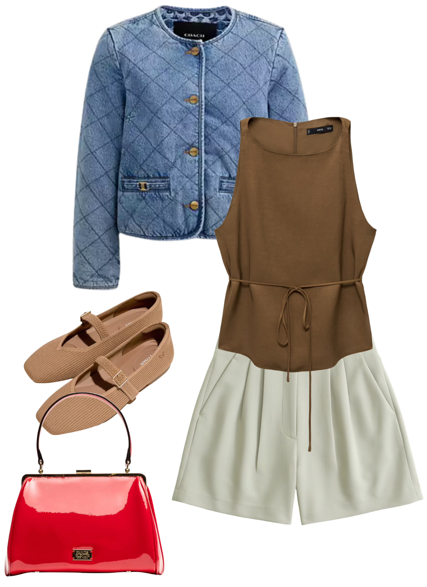 A&F Sloane Tailored Short / Mango Linen-Blend Tank / Coach Outlet Heritage C Quilted Denim Jacket / Vivaia Margot Walker Mary-Jane / Frances Valentine Frances Frame Bag Patent Leather Red
