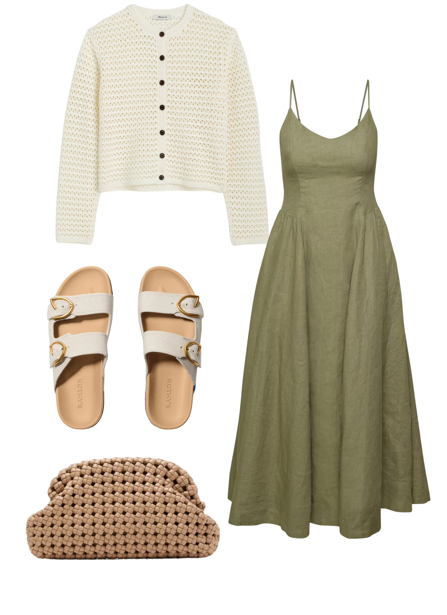 Baboon Technique Linen Dress / Madewell Open-Stitch Crewneck Sweater / Rothy’s The Buckle Slide / Olga Berg Natural Everly Handwoven Clutch