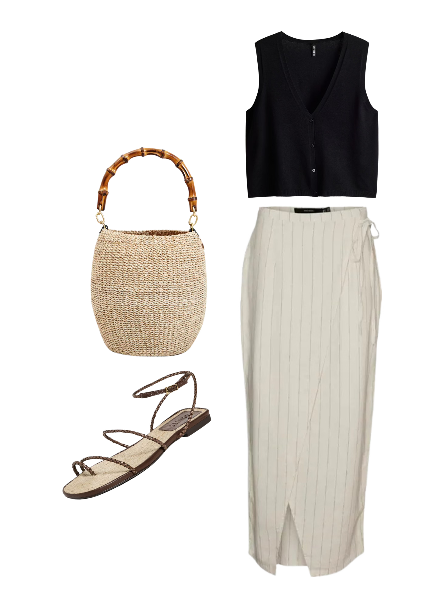 Vero Moda Mindy Pinstripe Linen Blend Faux Wrap Skirt / H&M Sweater Vest / Clare V. Pot de Miel Bag / Scutz Kaya Straw Sandal